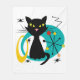 Colourful abstract Mid Century style illustration with black cat, black stars and colourful circles decoration on white background