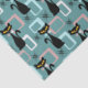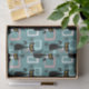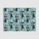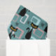 Colourful abstract Mid Century style pattern with black cat, black stars and colourful (blue, white, pink) cubes decoration on turquoise background for every cat lover, cat mum and cat dad.