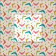 This is classic mid century modern boomerangs pattern with atomic starbursts in orange, pink, red , green and teal on light cream background.