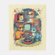 Blanket in a whimsical illustration featuring four playful cats enjoying retro media devices. One cat sits beside a vintage TV, while another, wearing red glasses, is perched on stacks of books and records. A turntable and cassette player evoke a mid-century aesthetic.