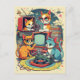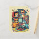 Postcard in a whimsical illustration featuring four playful cats enjoying retro media devices. One cat sits beside a vintage TV, while another, wearing red glasses, is perched on stacks of books and records. A turntable and cassette player evoke a mid-century aesthetic.