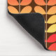 Mouse pad in a Mid-Century Modern Danish inspired textile pattern of stylised leaves - fire colours shading from deep mandarin orange to golden yellow, accented with tan, on a dark chocolate brown background
