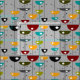 Mid-century modern half moons pattern resembling a floral pattern in colors of dark red, black, gold, teal and avocado green on a light grey background with fine lines.