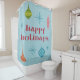 A mid century modern inspired Christmas design with colourful Christmas tree ornaments and sputnik starbursts, against a light blue background.