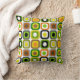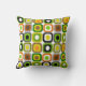 Mid-Century Modern Pillow funky abstract squares and circles in a brightly colourful design in shades of green grey, black brown and gold. Back of pillow in coordinating design. Perfect for any mid-century modern home and lifestyle.