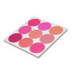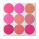 Ceramic tile in a Mid-Century Modern geometric print of large dots, in a grid of nine coordinating colours - shades of fuchsia, coral pink, coral orange, mauve and buff, on a white background