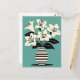 A cool teal flower bundle contrasts beautifully with a bright white-striped vase and orange background.