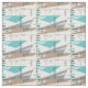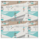 A mid-century modern abstract pattern fabric consisting of rectangles and triangles in colours of teal, brown and grey green on a white background.