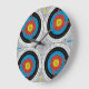 This wall clock has a archery targets pattern with mid century modern design style. There are bullseyes and scoop finders made into a geometric circle minimalist pattern design all covered with texture. Each hour is marked with a dash in a matching bullseye colour. You can make the pattern larger or smaller. A great design for anyone that is a sports fan of archery.