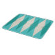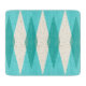 This Mid Century Modern Argyle Glass Cutting Board features a vibrant, turquoise background and a pattern of mod, translucent teal diamonds overlaying larger, vintage cream diamonds with gold coloured, space age speckles. This minimalist inspired, deconstructed argyle is a simplistic throwback of the larger than life atomic era that dominated the decorating landscape of the 1950s and 1960s. This kitschy design is reminiscent of everything from retro Palm Springs’ bowling alley signs to the television trays you used at your grandma’s house.