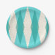 These Mid Century Modern Argyle Paper Plates (large print) feature a vibrant, turquoise background and a pattern of mod, translucent teal diamonds overlaying larger, vintage cream diamonds with gold coloured, space age speckles. This minimalist inspired, deconstructed argyle is a simplistic throwback of the larger than life atomic era that dominated the decorating landscape of the 1950s and 1960s. This kitschy design is reminiscent of everything from retro Palm Springs’ bowling alley signs to the television trays you used at your grandma’s house.