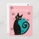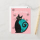 This mid century modern birthday postcard design features an atomic cat with retro design elements and blue and pink colour palette.