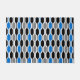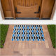 This doormat has a design of black, blue, and grey hexagons strung together on a field of white.