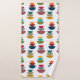 This towel set has a gold washcloth, a orange hand towel, and a bath towel with a mid-century modern design of semicircles stacked in three in retro colours on a field of white. Want the same design with different colours? Message me.