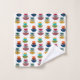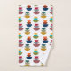This towel set has a mid-century modern design of semicircles stacked in three in retro colours on a field of white. Want the same design with different colours? Message me.