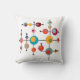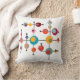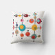 This throw pillow has a mid-century modern design of bubbles connected on black lines.