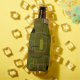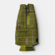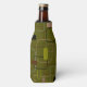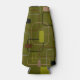 This bottle cooler has a mid-century modern design of rectangles in green, gray, brown, and black.