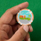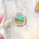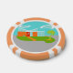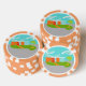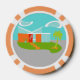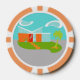 These Mid Century Modern Cartoon House Poker Chips will have you wanting to put out the WELCOME mat and make yourself at home! The 1960's, minimalist art design features a sleek, orange stone and aqua glass house on a lush, green, boomerang shaped lawn. The lawn forms an oasis in the middle of its grey, concrete surroundings. A green palm tree is swaying in the breeze. Four, orange stepping stones lead the way to the retro, red, front door with three, rectangular, glass window panes. To the left of the door, a turquoise flowerpot holds a tropical, green plant. The house has a sloping, V shaped white roof that is pointing towards two, white, kidney bean shaped clouds. The sky is a positively serene shade of aqua. No one will want to throw stones from this modern, glass house design! Buy this kitschy, space age product and be the coolest cat on your block!
