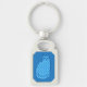 Metal Keychain with a Mid-Century Modern, retro cat design, in a sputnik / starburst pattern - light and medium sky blue, outlined in dark navy blue, on a medium cobalt blue background