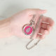 Watch in a Mid-Century Modern, retro cat design, in a sputnik / starburst pattern - light silver grey / grey with red, fuchsia pink, and white accents, outlined in black, on a deep fuchsia pink background