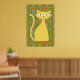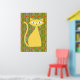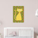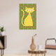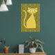 This fun poster features a bold retro inspired design in shades of orange, olive green and blue with a bright yellow cat.