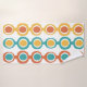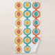 This towel set has an orange washcloth, a gold hand towel, and a bath towel with a mid-century modern design of circles connected together making a chain with white and coloured circles inside. Want different colours? Message me.