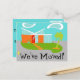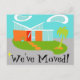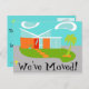 This Customisable Mid Century Modern Change of Address Postcard will have you wanting to put out the WELCOME mat and make yourself at home! The 1960's, minimalist art design features a sleek, orange stone and aqua glass house on a lush, green, boomerang shaped lawn. The lawn forms an oasis in the middle of its grey, concrete surroundings. A green palm tree is swaying in the breeze. Four, orange stepping stones lead the way to the retro, red, front door with three, rectangular, glass window panes. To the left of the door, a turquoise flowerpot holds a tropical, green plant. The house has a sloping, V shaped white roof that is pointing towards two, white, kidney bean shaped clouds. The sky is a positively serene shade of aqua. The front of this card says, "We've Moved!" Personalise the opposite side with your new contact information. No one will want to throw stones from this modern, glass house design! Buy this kitschy, space age product and be the coolest cat on your block!