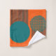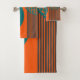 This towel set has a mid-century modern design of circles with lines coming out of them in teal and black on a field of orange.