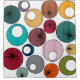 This shower curtain has a mid-century modern design of circles with starbursts and circles with circles inside in retro colors.