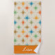 This is custom personalised beach towel featuring elegant mid century modern colourful atomic starburst pattern in different vibrant retro colours.