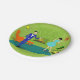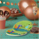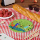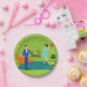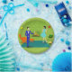 These Mid Century Modern Couple Paper Plates look like a scene out of a romantic comedy. The 1960's style, minimalist art design features an attractive cartoon couple enjoying a romantic evening at home. The sophisticated room prominently features a green stone wall with a roaring fire in the fireplace. The furnishings in the room include an orange, lounge chair with matching footstool, a red, starburst wall clock, a yellow, sputnik light fixture, and an orange side table, which is home to a green, portable record player. On the floor beside the end table, a vinyl record can be seen poking out of a kitschy album cover. In the centre of the green flooring, there is a large, rectangular, teal rug. In the middle of the scene, we have a very sophisticated couple. There is a suave man in a royal blue suit, white shirt and blue bow tie. The tall, dark and handsome man is gazing at his lovely companion. The elegant, raven haired woman is wearing a flouncy aqua dress. They are each holding a crystal martini glass with a floating olive. Cheers! Here's to the perfect evening at home!
