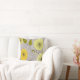 Mid-Century Modern Pillow dandelion clocks pillow in shades of yellow with green leaves on a grey, textured look background. Back of pillow with coordinating design and signed by artist, Gail Gabel.