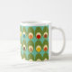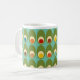 This mug has a mid-century modern design of green ovals with ovals and circles in them making them look like eggs in retro colors of red, yellow, blue, green, brown, and orange on a field of light blue.