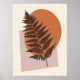 Poster in a mid-century modern, minimalist, boho style print of a large fern silhouette in dark coffee brown against geometric forms of rust and taupe, on a beige background