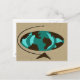 Travel around the world with this Mid Century Modern Globe Art Postcard. The design features an abstract oval globe with wood grain continents. The oceans are in shades of teal and turquoise. The globe is on a triangular wooden stand and the whole world is on a wheat coloured background.