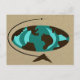 Travel around the world with this Mid Century Modern Globe Art Postcard. The front design features an abstract oval globe with wood grain continents. The oceans are in shades of teal and turquoise. The globe is on a triangular wooden stand and the whole world is on a wheat coloured background.