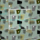 Mid-century modern rectangles pattern fabric in colors of green and shades of grey. Colors are that of the mid-century time period.