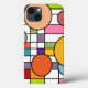 This phone case has a mid-century modern design of a grid with some rectangles coloured in and circles on top in retro colours.