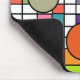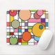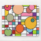 This mouse pad has a mid-century modern design of a grid with some rectangles coloured in and circles on top in retro colours.