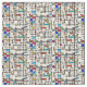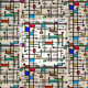 Mid-century modern grid pattern fabric in multiple colors with black lines and squares in a colorful pattern. Background color is a light cream.