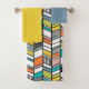 This towel set has a light blue washcloth, a gold hand towel, and a bath towel with a mid-century modern design of herringbone with retro colours and lines filling some of the spaces.