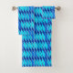 Towel set in a Mid-Century Modern design of abstract leaves in shades of cerulean and sky blue, accented with white, on a deep cobalt blue background
