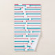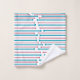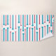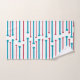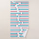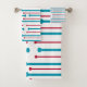 This towel set has a mid-century modern design of red and blue lines with circles on the ends on a field of white.