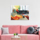 Midcentury modern living room graphic design wrapped canvas art with clean lines black sofa and orange womb chair. Glass coffee table to set your cocktail on. With aqua, yellow and white accents. Vintage retro chic decor for your home.