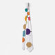 This tie has a mid-century modern design of black lines with circles of different colours and sizes on a field of white.