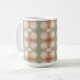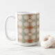 "Mid Century Modern Organic Geometric Art Mint, Sage Green, Cream and Rust Coffee Cup." Mid Century Modern inspired (but new art) repeat pattern design with organic circles and diamond geometric elements and a colour palette of warm, sage mint green, cream and rust for a soothing, relaxing home decor design. Art by internationally licensed artist and designer, Audrey Jeanne Roberts, copyright.