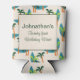 Easily personalised for a special birthday or for any event, this can cooler features a Mid Century influenced pattern of simple palm tree graphics in orange and green set around a boomerang shaped oasis or swimming pool in a vivid aqua blue. The sand background colour may be edited.