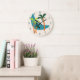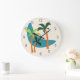 This cool wall clock with a retro vibe features a Mid Century inspired graphic of minimalist palm trees in orange and green set around a boomerang shaped oasis or swimming pool in an aqua blue. The sand background colour may be edited.