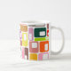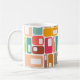 This mug has a mid-century modern design of rectangles with a white hole in retro colours.