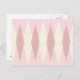 This Mid Century Modern Pink Argyle Postcard features a First Lady pink background and a pattern of mod, translucent, blush diamonds overlaying larger, vintage cream diamonds with gold coloured, space age speckles. This minimalist inspired, deconstructed argyle is a simplistic throwback of the larger than life atomic era that dominated the decorating landscape of the 1950s and 1960s. This kitschy design is reminiscent of everything from retro Palm Springs’ bowling alley signs to classic TV shows to the television trays you used at your grandma’s house.